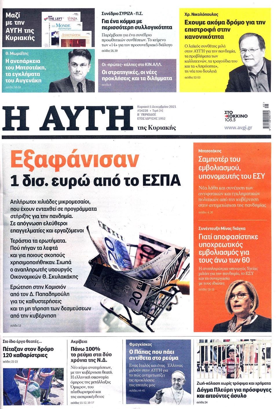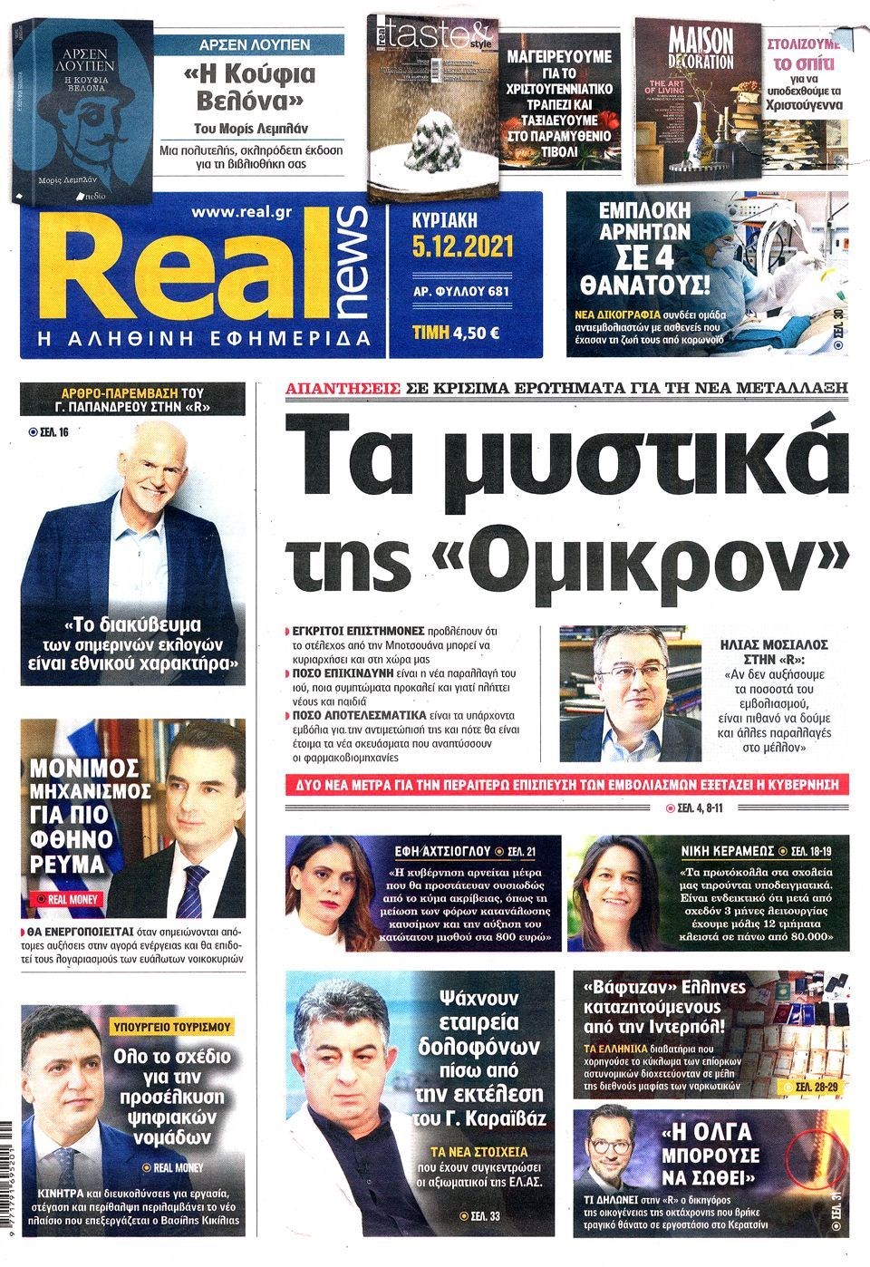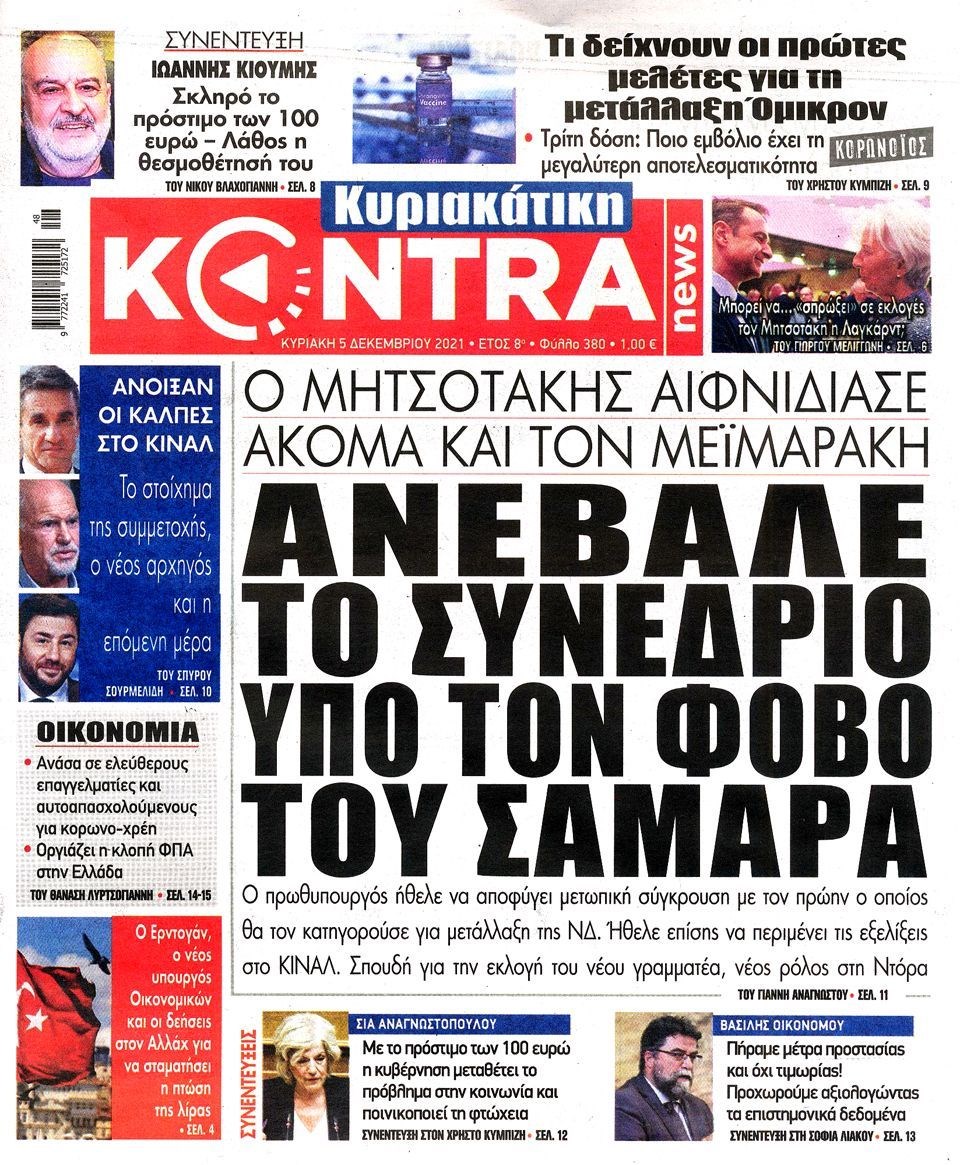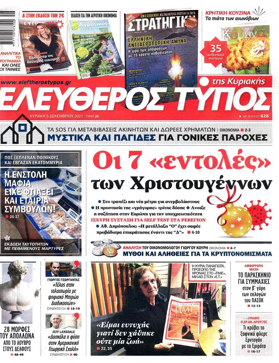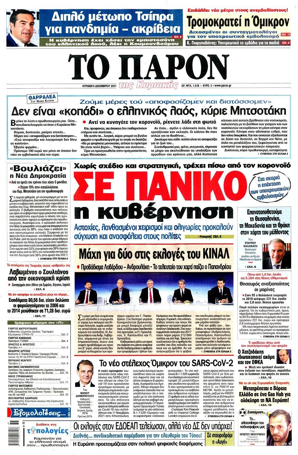 Οι εξελίξεις γύρω από την πανδημία, την μετάλλαξη Όμικρον, τα μέτρα στη χώρα μας ενόψει των Χριστουγέννων, αλλά και οι εκλογές για την ανάδειξη του νέου προέδρου στο Κίνημα Αλλαγής προβάλλονται στις πρώτες σελίδες των εφημερίδων της Κυριακής 5 Δεκεμβρίου.