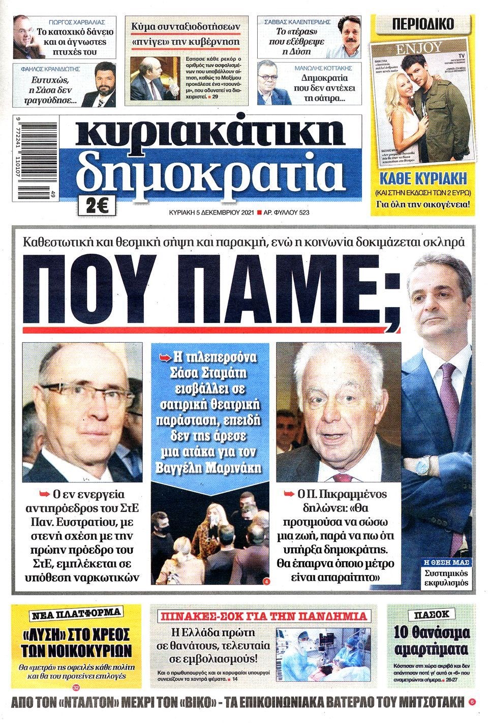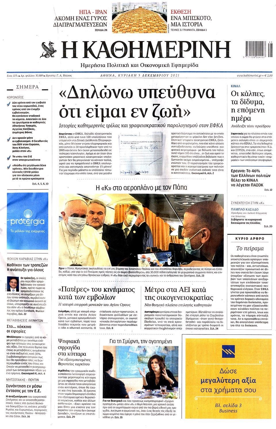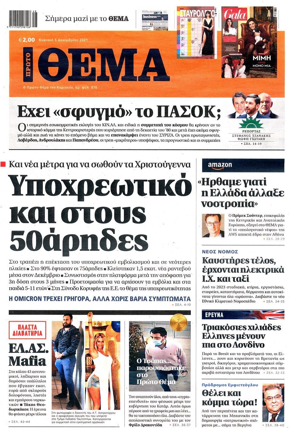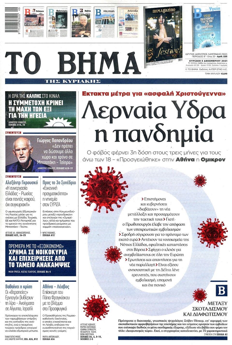 Οι εξελίξεις γύρω από την πανδημία, την μετάλλαξη Όμικρον, τα μέτρα στη χώρα μας ενόψει των Χριστουγέννων, αλλά και οι εκλογές για την ανάδειξη του νέου προέδρου στο Κίνημα Αλλαγής προβάλλονται στις πρώτες σελίδες των εφημερίδων της Κυριακής 5 Δεκεμβρίου.