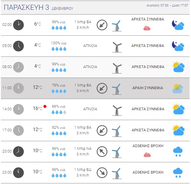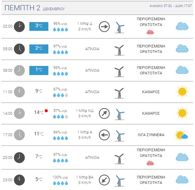 Σήμερα Πέμπτη 2 Δεκεμβρίου 2021 αναμένονται νεφώσεις με τοπικές βροχές και σποραδικές καταιγίδες στα δυτικά. Τα φαινόμενα τις απογευματινές ώρες θα ενταθούν, ενώ παράλληλα τοπικές βροχές θα εκδηλωθούν σε νησιωτικά τμήματα του Ανατολικού Αιγαίου, στις Κυκλάδες, στην Κρήτη και ενδεχομένως στη Θράκη. Τη νύχτα και νωρίς το πρωί στα κεντρικά και βόρεια ηπειρωτικά θα εκδηλωθεί παγετός, ενώ κατά τόπους η ορατότητα θα είναι περιορισμένη και θα σχηματιστούν ομίχλες.