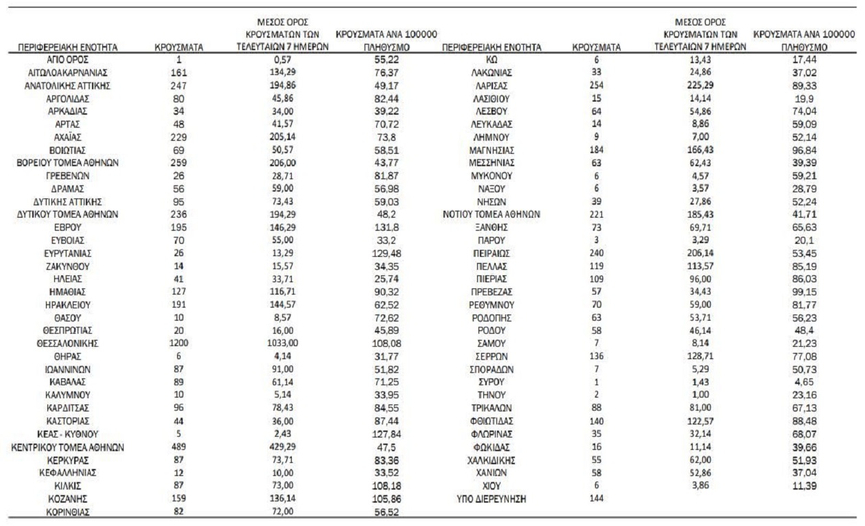 Ο πίνακας του ΕΟΔΥ με τα κρούσματα ανά περιοχή: