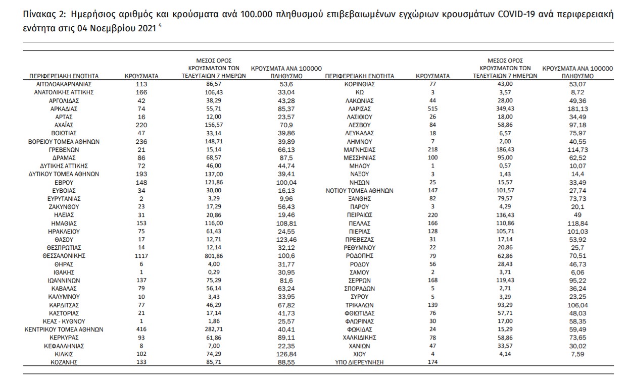 Αξίζει να σημειωθεί ότι η Περιφερειακή Ενότητα Λάρισας παραμένει στην κορυφή, αναφορικά με τον αριθμό κρουσμάτων ανά 100.000 κατοίκους, σε σχέση με το σύνολο των Ενοτήτων, με τον σχετικό δείκτη να διαμορφώνεται στο 181,13.