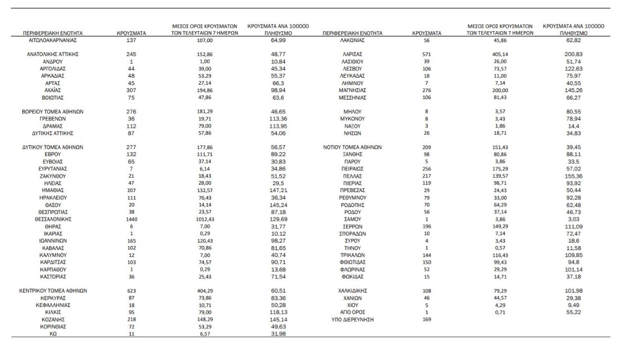 Ο συνολικός αριθμός των κρουσμάτων ανέρχεται σε 801.208 (ημερήσια μεταβολή +1.1%), εκ των οποίων 50.7% άνδρες. Με βάση τα επιβεβαιωμένα κρούσματα των τελευταίων 7 ημερών, 140 θεωρούνται σχετιζόμενα με ταξίδι από το εξωτερικό και 2.341 είναι σχετιζόμενα με ήδη γνωστό κρούσμα.