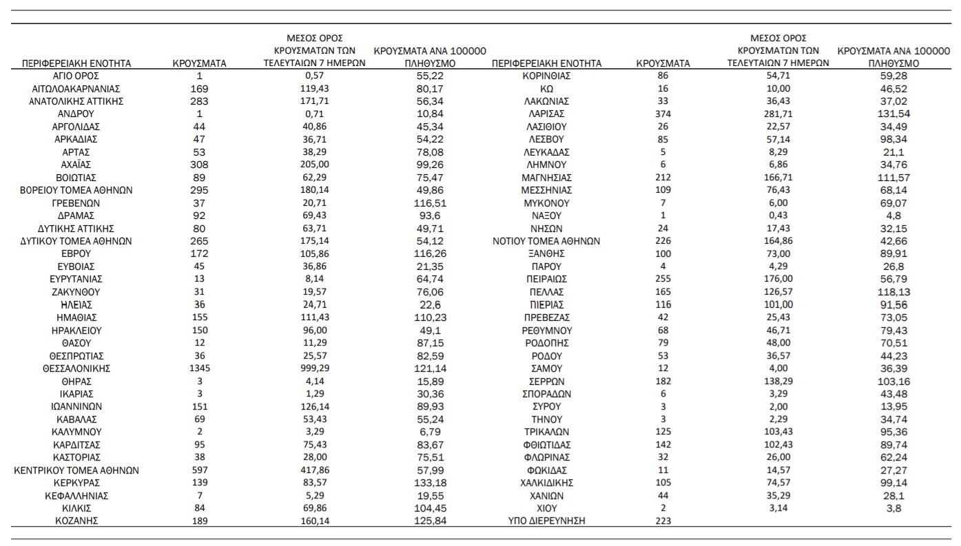 Ο συνολικός αριθμός των κρουσμάτων ανέρχεται σε 847.188 (ημερήσια μεταβολή +1.0%), εκ των οποίων 50.7% άνδρες. Με βάση τα επιβεβαιωμένα κρούσματα των τελευταίων 7 ημερών, 110 θεωρούνται σχετιζόμενα με ταξίδι από το εξωτερικό και 2.583 είναι σχετιζόμενα με ήδη γνωστό κρούσμα.