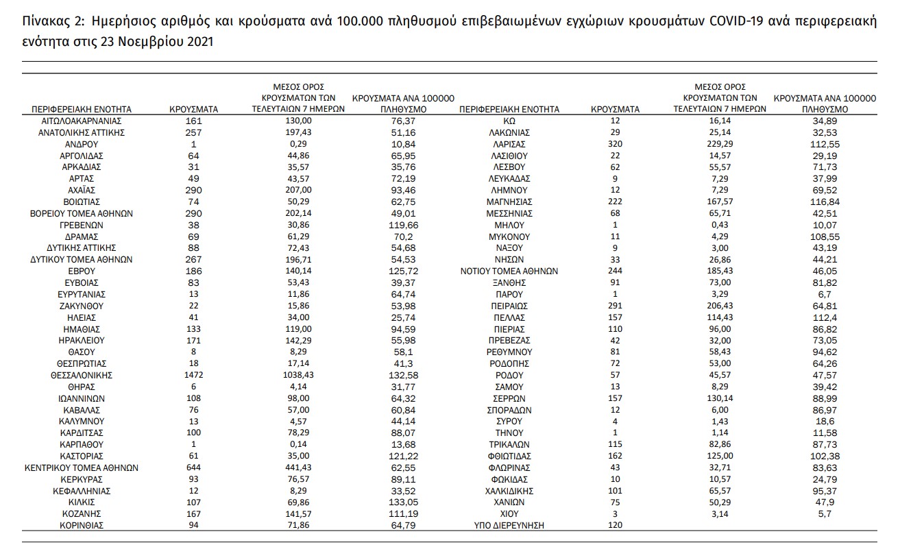 23/11/2021 23/11/2021 Σε όλη τη χώρα, με βάση τα δεδομένα που έχουν δηλωθεί στον ΕΟΔΥ και καταγραφεί μέχρι τις 23 Νοεμβρίου 2021 (ώρα 15:00), τα νέα εργαστηριακά επιβεβαιωμένα κρούσματα της νόσου που καταγράφηκαν τις τελευταίες 24 ώρες είναι 8.100, εκ των οποίων 10 εντοπίστηκαν κατόπιν ελέγχων στις πύλες εισόδου της χώρας. Ο συνολικός αριθμός των κρουσμάτων ανέρχεται σε...