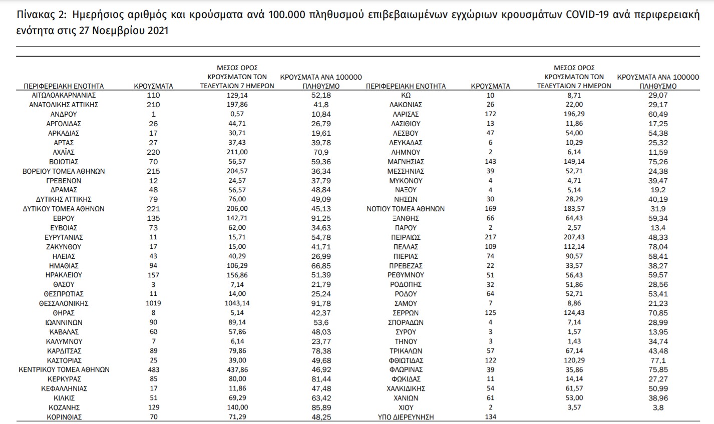Σε όλη τη χώρα, με βάση τα δεδομένα που έχουν δηλωθεί στον ΕΟΔΥ και καταγραφεί μέχρι τις 27 Νοεμβρίου 2021 (ώρα 15:00), τα νέα εργαστηριακά επιβεβαιωμένα κρούσματα της νόσου που καταγράφηκαν τις τελευταίες 24 ώρες είναι 5.870 , εκ των οποίων 12 εντοπίστηκαν κατόπιν ελέγχων στις πύλες εισόδου της χώρας.