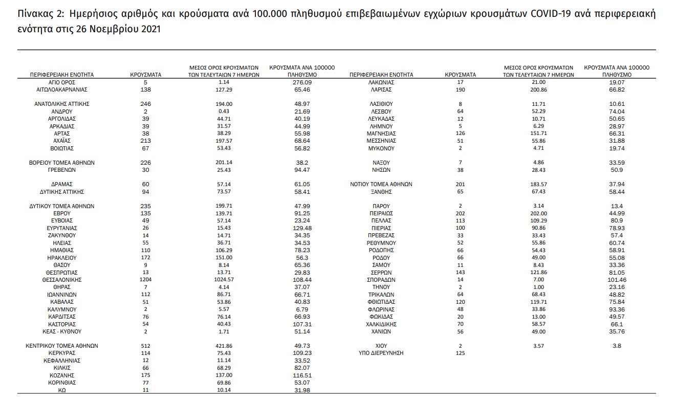 Σε όλη τη χώρα, με βάση τα δεδομένα που έχουν δηλωθεί στον ΕΟΔΥ και καταγραφεί μέχρι τις 26 Νοεμβρίου 2021 (ώρα 15:00), τα νέα εργαστηριακά επιβεβαιωμένα κρούσματα της νόσου που καταγράφηκαν τις τελευταίες 24 ώρες είναι 6.602 , εκ των οποίων 14 εντοπίστηκαν κατόπιν ελέγχων στις πύλες εισόδου της χώρας.