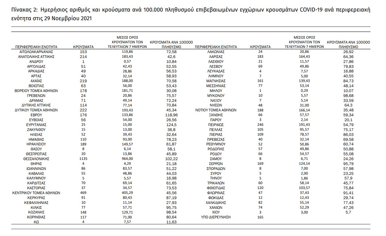 Σε όλη τη χώρα, με βάση τα δεδομένα που έχουν δηλωθεί στον ΕΟΔΥ και καταγραφεί μέχρι τις 29 Νοεμβρίου 2021 (ώρα 15:00), τα νέα εργαστηριακά επιβεβαιωμένα κρούσματα της νόσου που καταγράφηκαν τις τελευταίες 24 ώρες είναι 6.677 , εκ των οποίων 11 εντοπίστηκαν κατόπιν ελέγχων στις πύλες εισόδου της χώρας.