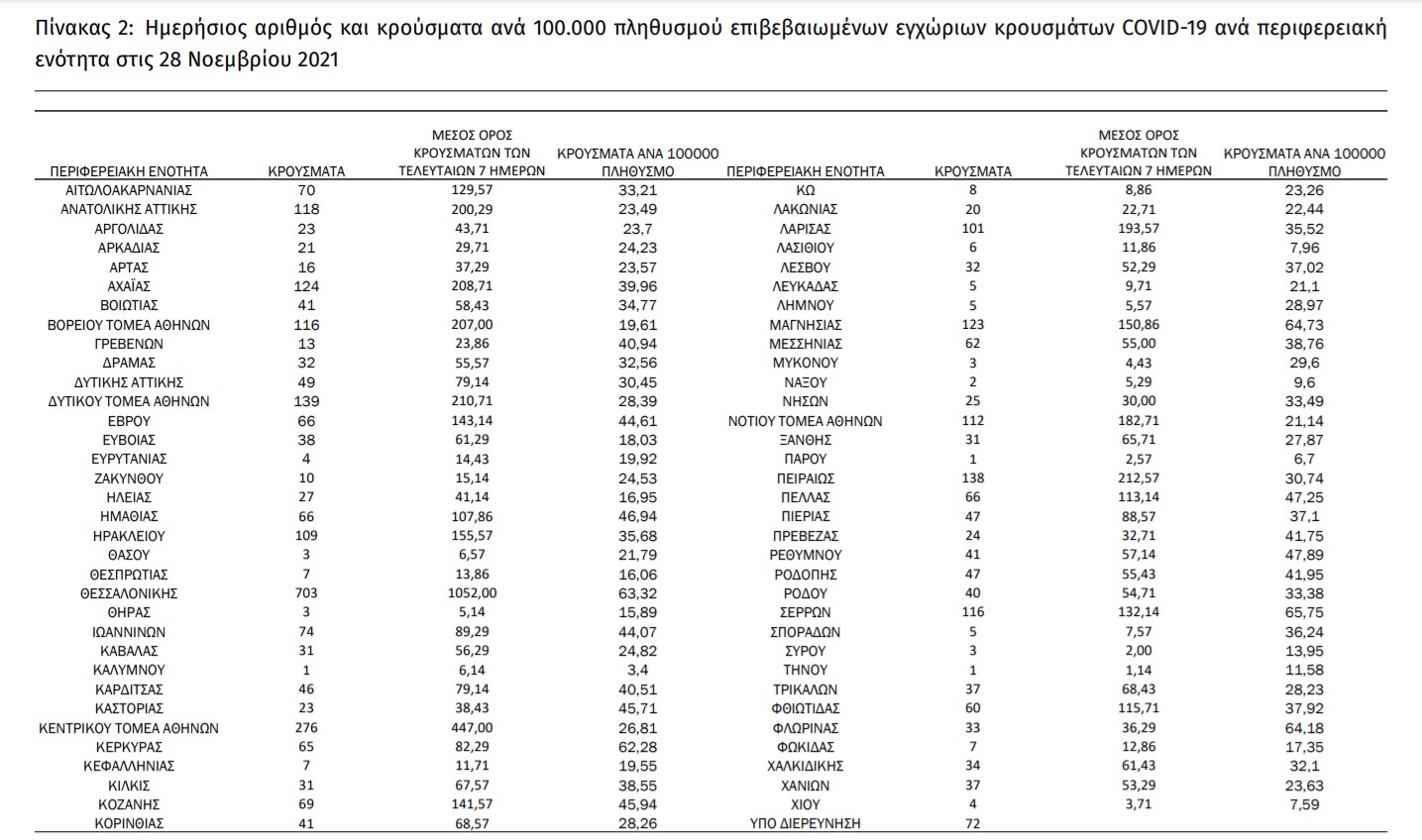 Σε όλη τη χώρα, με βάση τα δεδομένα που έχουν δηλωθεί στον ΕΟΔΥ και καταγραφεί μέχρι τις 28 Νοεμβρίου 2021 (ώρα 15:00), τα νέα εργαστηριακά επιβεβαιωμένα κρούσματα της νόσου που καταγράφηκαν τις τελευταίες 24 ώρες είναι 3.823 , εκ των οποίων 10 εντοπίστηκαν κατόπιν ελέγχων στις πύλες εισόδου της χώρας.