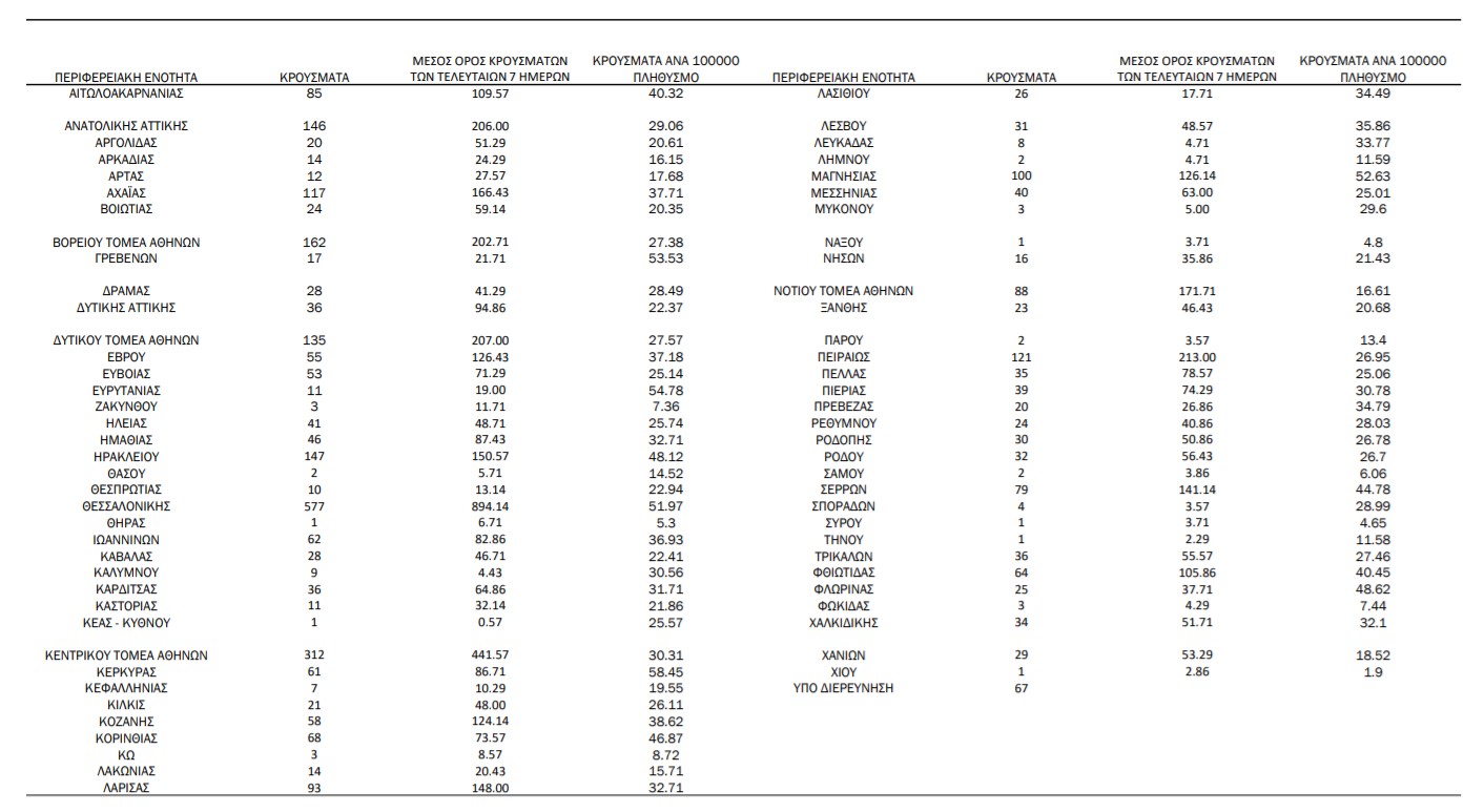 Ο συνολικός αριθμός των κρουσμάτων ανέρχεται σε 966.221 (ημερήσια μεταβολή +0.4%), εκ των οποίων 50.5% άνδρες. Με βάση τα επιβεβαιωμένα κρούσματα των τελευταίων 7 ημερών, 94 θεωρούνται σχετιζόμενα με ταξίδι από το εξωτερικό και 2.912 είναι σχετιζόμενα με ήδη γνωστό κρούσμα.