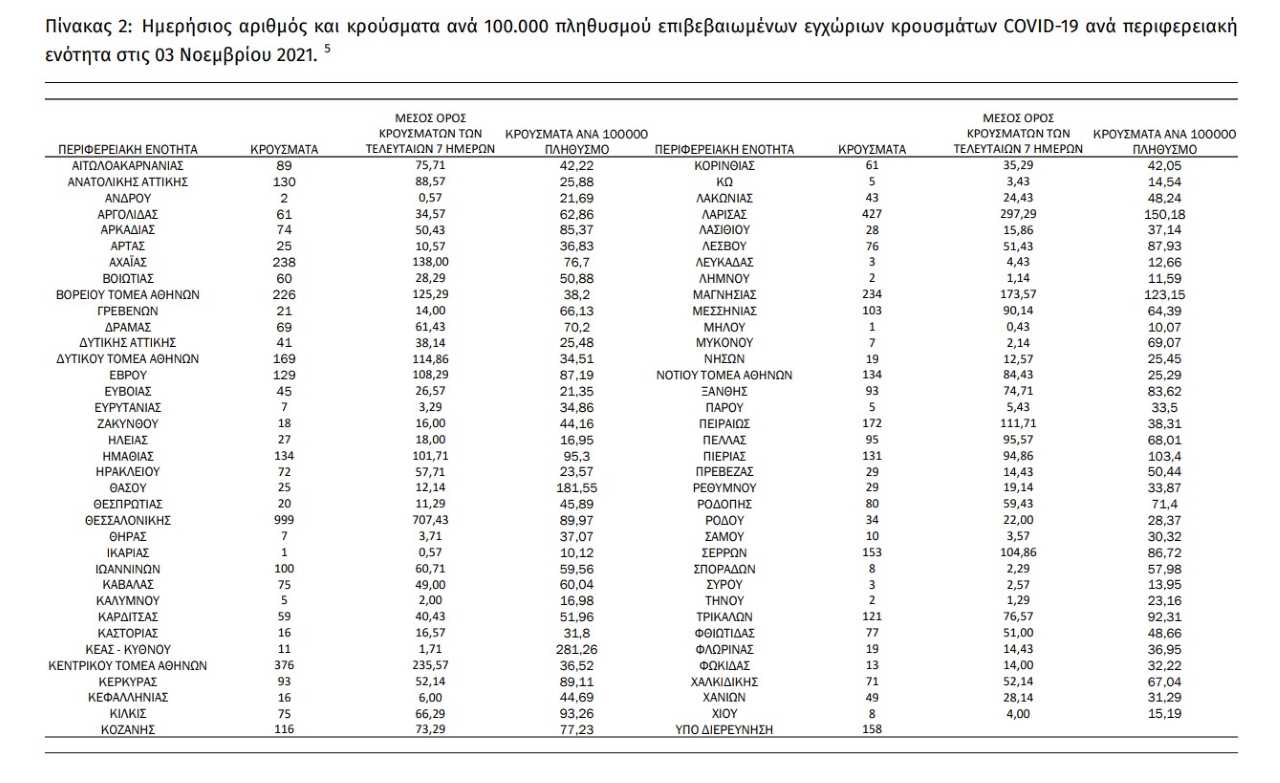 Σε όλη τη χώρα, με βάση τα δεδομένα που έχουν δηλωθεί στον ΕΟΔΥ και καταγραφεί μέχρι τις 03 Νοεμβρίου 2021 (ώρα 15:00), τα νέα εργαστηριακά επιβεβαιωμένα κρούσματα της νόσου που καταγράφηκαν τις τελευταίες 24 ώρες είναι 6.150, εκ των οποίων 8 εντοπίστηκαν κατόπιν ελέγχων στις πύλες εισόδου της χώρας.
