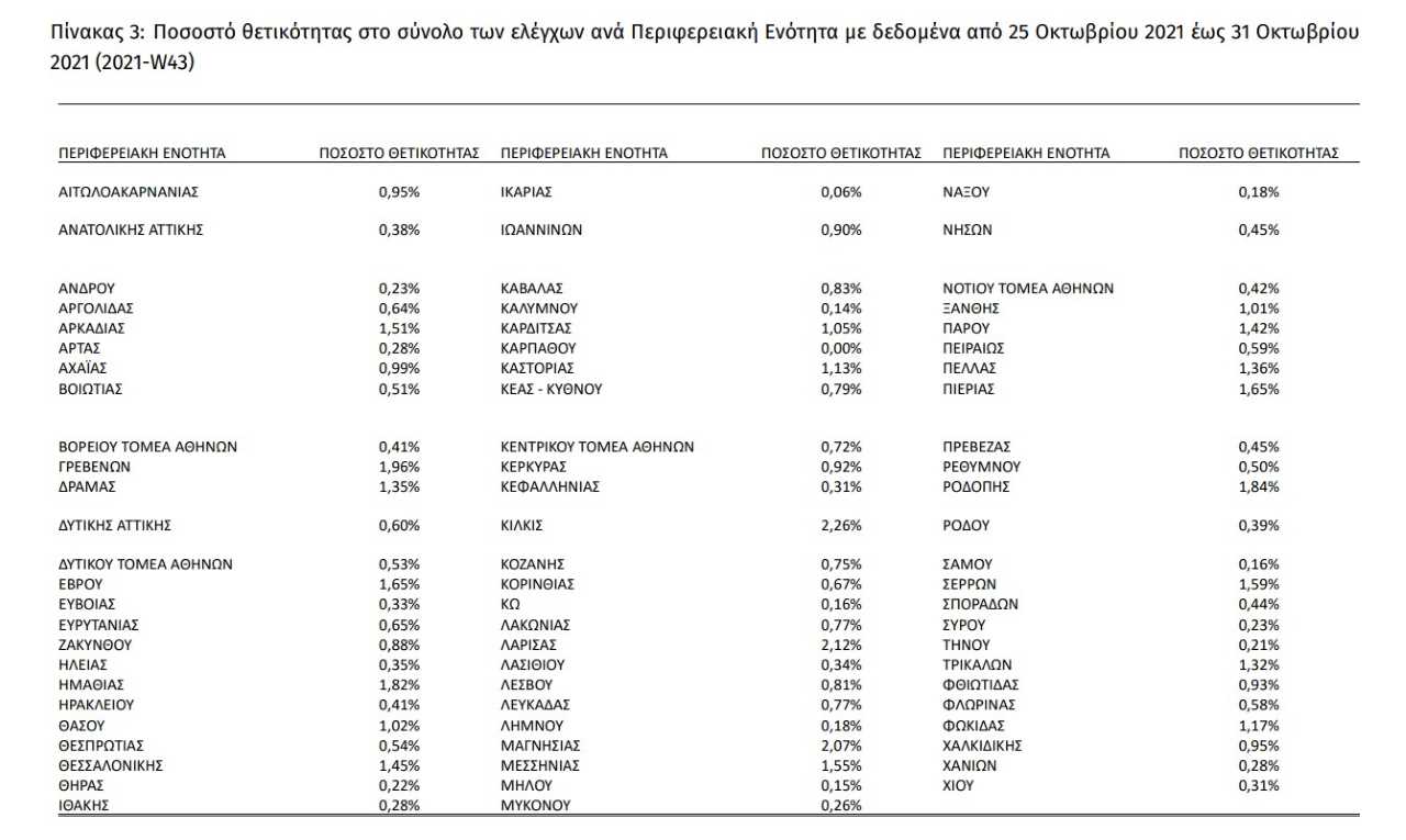 Στο σύνολο των ελέγχων, για την εβδομάδα αναφοράς 25 Οκτωβρίου 2021 – 31 Οκτωβρίου 2021 (2021-W43), το ποσοστό θετικότητας ήταν 0.92%.